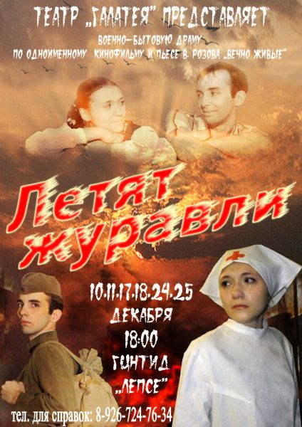 Солнечногорский театр "Галатея" представляет спектакль "Летят журавли" 10, 11, 17, 18, 24, 25 декабря Стектакль "Летят журавли" театра "Галатея" по одноименному кинофильму и пьесе В. Розова "Вечно живые", состоится на сцене ГЦНТИД "Лепсе".Начало в 18.00. Справки по тел. 926-724-76-34 |